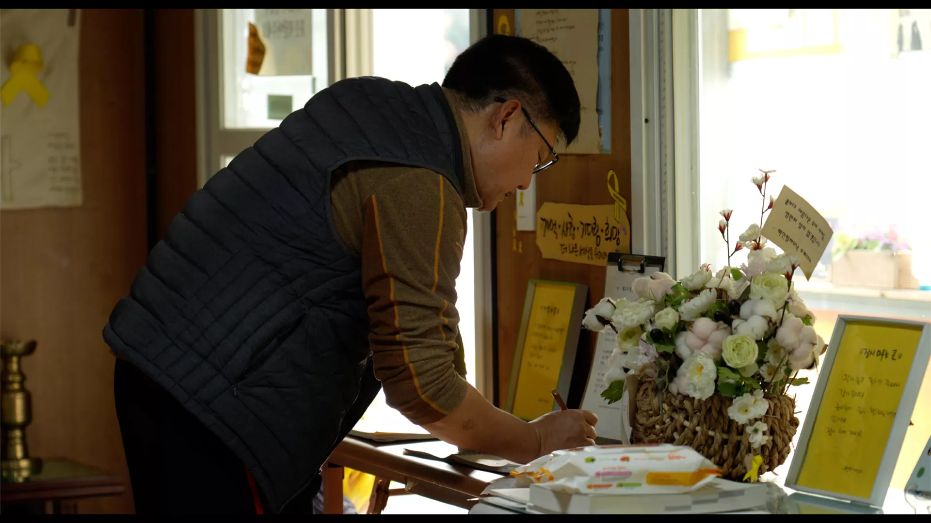 Myeong-im packs clothes and food before departing for Paengmok Harbor. She heads to Jindo Island, leaving behind the familiar scenery that she has passed countless times over the past decade. She arrives at the temporary container building with the rusty signboard written ‘Truth does not sink’, unpacks, and organizes her surroundings. The other parents who have come also start to get organized. The camera captures the memorial hall, and the stories of the parents. About waiting, about protecting the old, cold, lonely Paengmok Harbor.